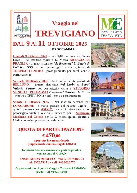 La comunità pastorale Santo Crocifisso di Meda, ha organizzato un viaggio nel Trevigiano, nelle giorni dal 09 all’11 ot…