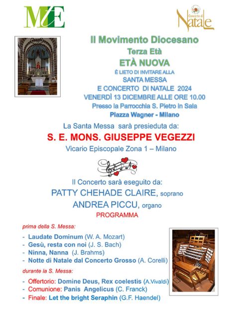 Il Movimento Diocesano Terza Età – ETÀ NUOVA è lieto di invitare alla SANTA MESSA E CONCERTO DI NATALE presso la Parroc…