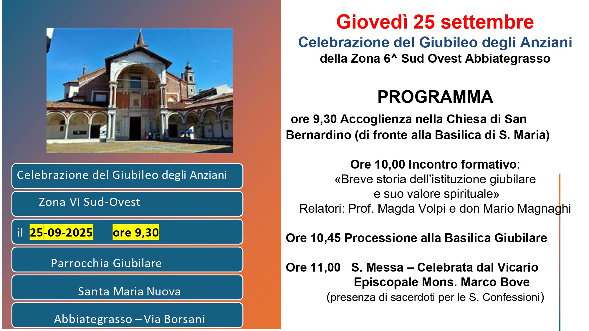 IL Movimento Terza Età-ETA’ NUOVA di Abbiategrasso organizza per il giorno giovedì 25 settembre 2025IL GIUBILEO DEGLI ANZIANI. Inizio alle ore 9.30 nella chiesa di San Bernardino (di fronte alla Basilica Santa Maria) seguirà alle 10 un incontro formativo dal titolo “Breve storia dell’istituzione giubilare e suo valore spirituale” tenuto dai relatori Prof. Magda Volpi e Don Mario Magnaghi, si procederà con la processione verso la basilica Giubilare, concluderà il tutto la Santa Messa celebrata da Mons. Marco Bove.