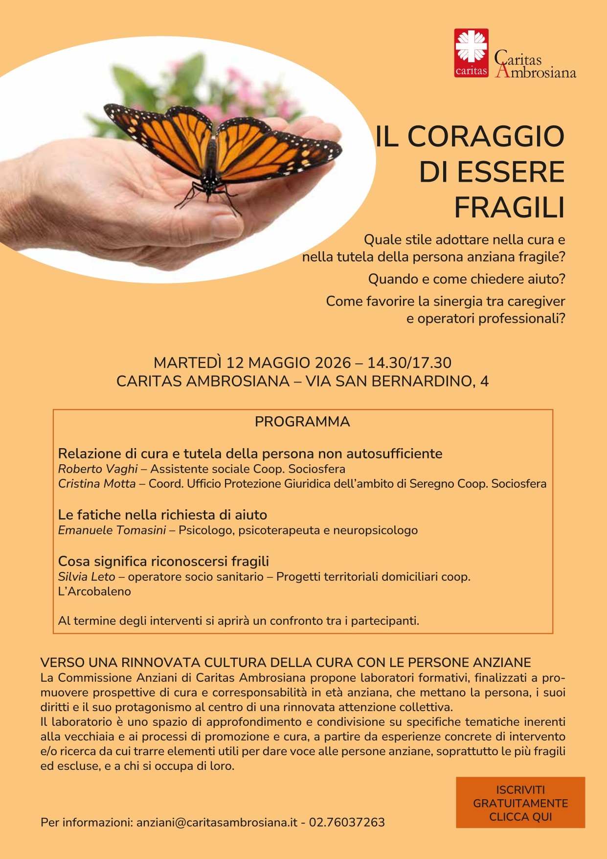 Caritas Ambrosiana organizza il giorno 12 maggio 2026 dalle ore 14.30 alle ore 17.30 il convegno dal titolo ” IL CORAGGIO DI ESSERE FRAGILI” Quale stile adottare nella cura e nella tutela della persona anziana fragile? quando e come chiedere aiuto? Come favorire la sinergia tra caregiver e operatori professionali?