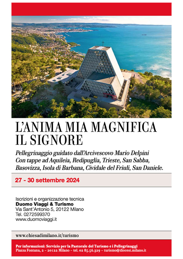 Pellegrinaggio guidato dall’Arcivescovo Mario Delpini, con tappe ad Aquileia, Redipuglia, Trieste, San Sabba, Basovizza, Isola di Barbana, Cividale del Friuli, San Daniele. 27-30 settembre 2024