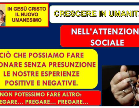 - Nell’attenzione sociale … e cosa possiamo fare noi, nel nostro piccolo, per il bene comune se non donare, senza presunzione, le nostre esperienze, positive e/o negative, perché anche gli errori possono servire, se offerti con tutta umiltà. Se poi, qualcuno non potesse fare altro, per gli altri, potrà comunque pregare, pregare per tutti, come continua a dire papa Francesco che, a otto anni dalla sua elezione, ha scritto una nuova enciclica, “Fratelli tutti”, che rappresenta il punto di confluenza di ampia parte del suo magistero. La fratellanza è stata il primo tema al quale Francesco ha fatto riferimento dando inizio al suo Pontificato, quando ha chinato la testa davanti alla gente radunata in piazza San Pietro. Lì ha definito la relazione vescovo-popolo come «cammino di fratellanza» e ha espresso questo desiderio: «Preghiamo sempre per noi, l’uno per l’altro. Preghiamo per tutto il mondo, perché ci sia una grande fratellanza»…